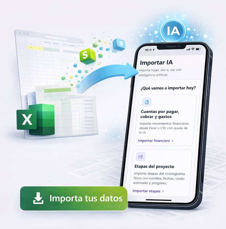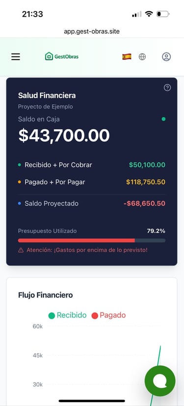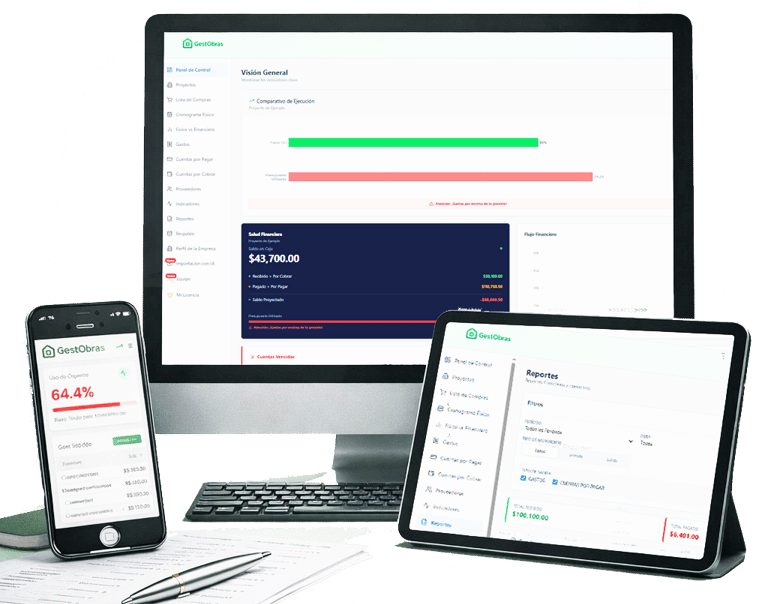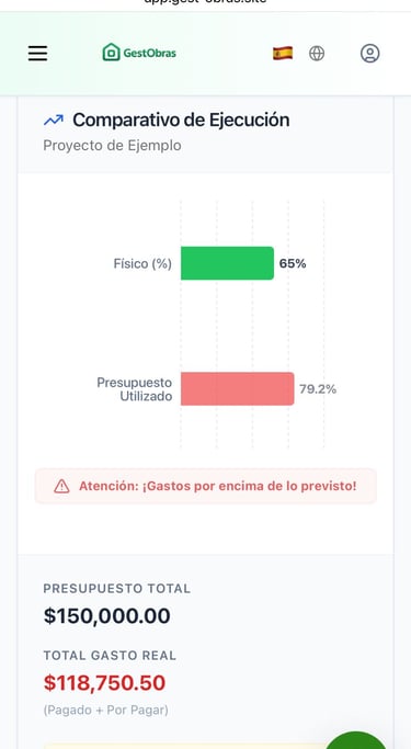 El sistema cruza presupuesto, gastos y progreso físico para mostrar en tiempo real la situación financiera y ayudarte a tomar mejores decisiones.